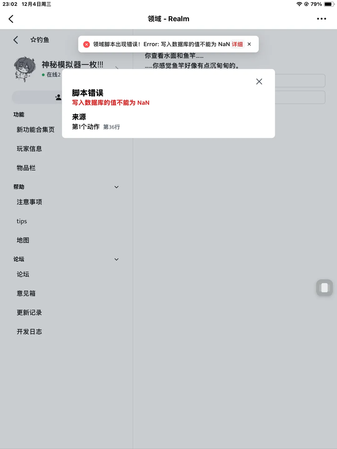现在应该是修好了,,!宝你再试一下,如果被卡出对话且没钓到鱼的话我发点物资补偿一下x